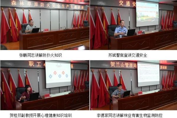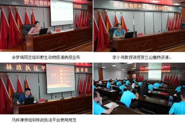 此次培训班的主要内容有:自治区森林草原防火处张鹏同志讲解了森林草原扑火物资管理、森林草原火灾的发生、预防、扑救等,为参加培训人员上了一堂深入浅出、理论实际相结合的森林草原防火知识培训课。银川市交警西夏区二大队苏斌警官,结合交通事故的实际案例,从事故发生的原因、如何预防交通事故等方面讲解了如何安全出行的相关知识。宁夏警官职业学院贺桂芬副教授以“好好说话 非暴力沟通”为主题开展了心理健康知识培训。宁夏森林病虫防治检疫总站李德家、余梦琦同志,分别讲解了林草系统外来入侵物种普查技术要点及生物多样性监测调查平台使用、野生动物疫源疫病监测技术。宁夏大学李小伟教授,详细讲解了贺兰山珍稀濒危植物和常见植物的特性、分布、科研价值和经济价值。宁夏言成律师事务所马科律师对规范使用林政执法平台进行了专业培训。我局李静尧同志讲解了红外相机监测野生动物技术。