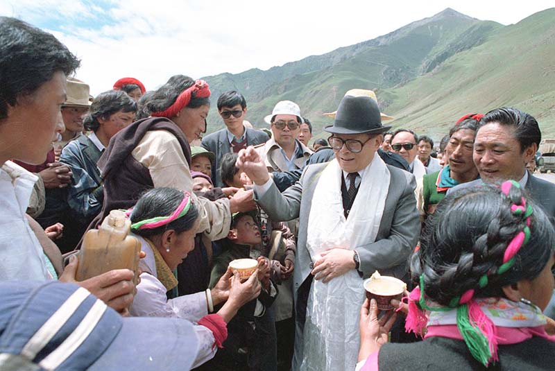1990年7月25日,江泽民同志与藏族群众共庆望果节。