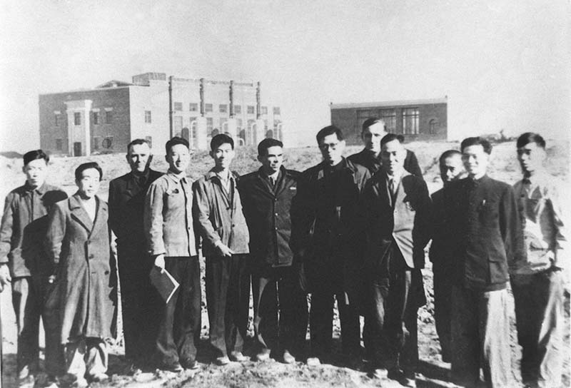 1956年,江泽民同志(左七)在长春第一汽车制造厂同援建一汽的苏联专家等合影。