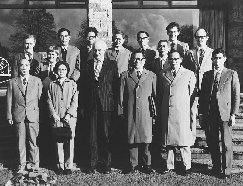 1964年6月,江泽民同志(二排右一)在法国艾克斯莱班出席国际电工委员会会议期间同与会代表合影。