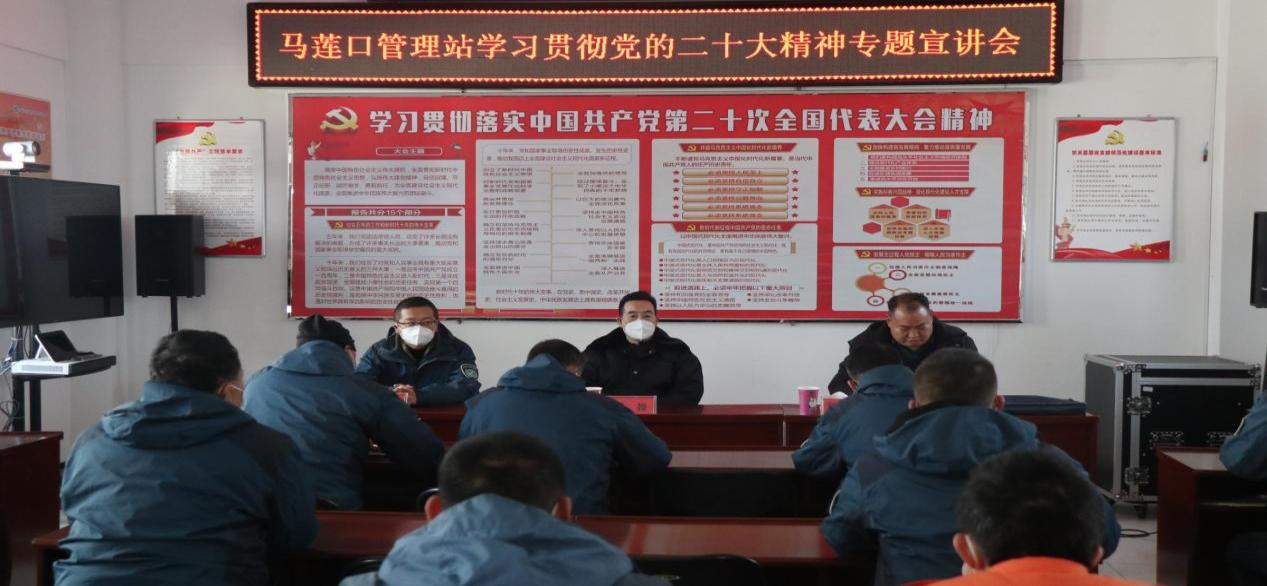 为深入学习宣传贯彻党的二十大精神,全面理解和准确把握党的二十大报告的丰富内涵和精神实质,让党的二十大精神落实到基层,扎根基层,1月17日,管理局党委书记蒋操,党委委员、副局长郑元杰到马莲口管理站开展党的二十大精神专题宣讲活动,马莲口管理站全体党员干部职工23人参加本次会议。