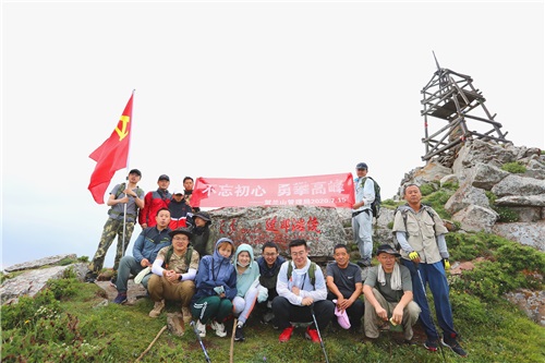 活动中,队员们克服路途湿滑和自身体力极限的考验,经过14个小时艰苦跋涉顺利完成了登顶活动的各项内容,让党旗在海拔3556.1米主峰迎风飘扬,在沿途监测点安设了红外相机。在主峰开展的主题党日活动中,吴涛同志带领队员们重温了习近平总书记视察宁夏时重要讲话精神,科研科负责人王继飞介绍了主峰敖包疙瘩的基本情况,队员们从征途中感慨“登顶绝不是说说那么容易,成功从来不是简单”,到登顶时切身体会总书记的话语:“山再高,往上攀,总能登顶;路再长,走下去,定能到达”。
