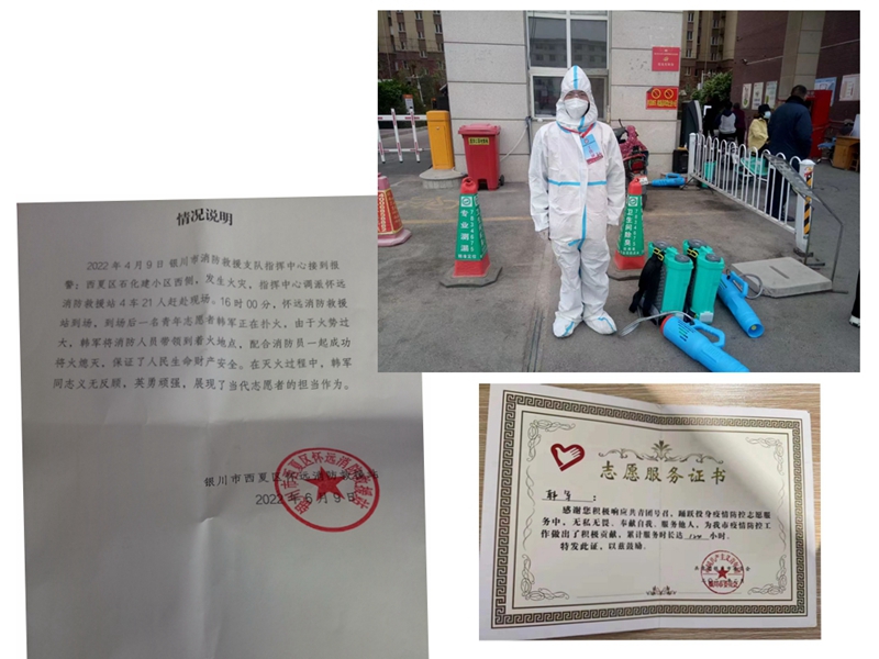 2022年4月9日,西夏区石化建小区西侧因意外发生火灾,当时韩军同志正在石化建小区做垃圾清理志愿活动,当他发现火情后第一时间报警并找到灭火器开展紧急灭火工作,在怀远消防救援站消防人员到场后,主动带领消防人员到达着火地点,并配合消防人员一起成功将火熄灭,保证了人民生命财产安全。事后银川市西夏区怀远消防救援站高度赞扬了韩军同志在灭火过程中义无反顾、沉着冷静的表现和英勇顽强、见义勇为的精神。