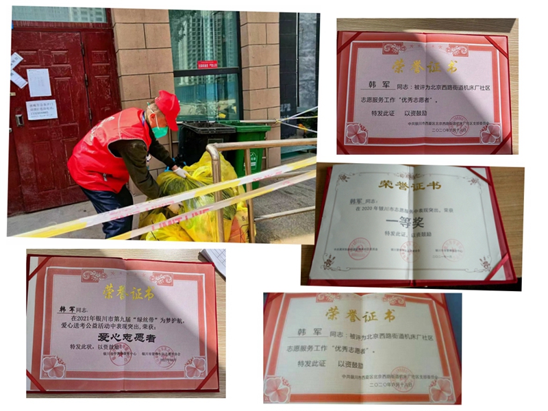 生活中,他热心公益,喜欢发扬雷锋精神,经常参加社区垃圾分类、美丽家园清洁、疫情服务等志愿者活动。2021年银川疫情防控期间,他积极报名参加金凤区北京中路、北京西路街道办事处组织的志愿者工作,坚守在抗疫第一线,数月冒着凛冽的寒风在安居苑社区、机床厂社区一边充当着门卫的工作,一边还担当着居民的“跑腿员”,帮居家隔离人员采买生活必备物资、防护用品等。因工作出色,不怕吃苦,多次被金凤区新时代文明实践中心办公室、银川志愿者协会、宁夏退役军人就业创业促进会、社区支部委员会等评为“爱心志愿者”“优秀志愿者”“最美志愿者”。
