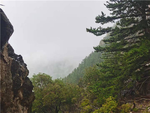 每一天的样地的调查都是一段惊险刺激的旅程,第一天的样地最远,来回十公里的山路,如同“指压板”似的山路让大家磨破了脚底;第二天的样地最陡,陡峭的山坡累得大家回到营地后,就摊坐在地上不在想起来;第三天的样地较为轻松,离得近路也好走些,大家也借此短暂的休整了一下;第四天的样地最难,出发时山上的天空就散发着一股阴翳的气息,接着就是雾雨蒙蒙,随后而来的乌云开始密集的聚在一起,翻滚而来,顿时瓢泼大雨倾斜而下,哗啦啦的雨击打岩石的声音在我们耳边炸响,我们只得停住脚步,急忙去找寻周围的避雨的地方,呆呆的望着天空,盼望着乌云早些散去,继续接下来的调查。在等待的时候,大家开始从背包分发干粮,狼吞虎咽开始吃起来,在雨势逐渐变小,变成细雨拉成一条断断续续的直线在从中滴流,这时组长吆喝了一声,我们便起身出发,排起了长队开始慢慢向上前进,时而前后注意着队友,拉着他们向上攀登,时而躬下腰揽住前面树枝,为后面的队友开辟道路,汗水和雨滴混合一起,使得眼镜都模糊了,不小心撞到了前面的队友,不禁惹的大家一阵逗笑,朗朗的笑声回荡在山谷,远处的山林仿佛也在附和着我们,伴着悠长的回声在空荡的山谷传递,渐行渐远。之后我们回到了营地,却发现此时的帐篷已进了水,大家无法躺下睡觉,只能抖了抖,甩干后坐在帐篷里聊天,不知聊到什么时候了,眼皮开始打架,醒来之后天已经麻麻亮了,这才发现,我们和雨水共度了一夜,浑身上下已经全部湿透了,赶快起来熬了锅姜汤驱寒,分发感冒药,以防着凉;第五天的样地最让人担心,本以为简单的样地应该很快就能结束,但走到离样地不远距离,却没想到无处可上,该样地周围都是复杂危险的地形,只能让我们不断的绕道而行,不知不觉就走了大半天过去,才到达了样地,完成了调查。从清晨天还未亮的时候出发,到了晚上九点多才伴雨归来,着实让营地里等待的同志们悬着的心落了地,所幸工作也已完成,大家都安全归来;到了最后一天,这是我们完成任务该出山的时候,大家怀着亢奋的心情,一大早就鼓足了精神想要尽快出山,前几日的疲惫此时一扫而光,终于紧赶慢赶,赶着太阳下山前从山里走了出来。